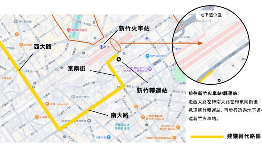 即可抵達【新竹轉運站】,再步行通過地下道前往【新竹火車站】。